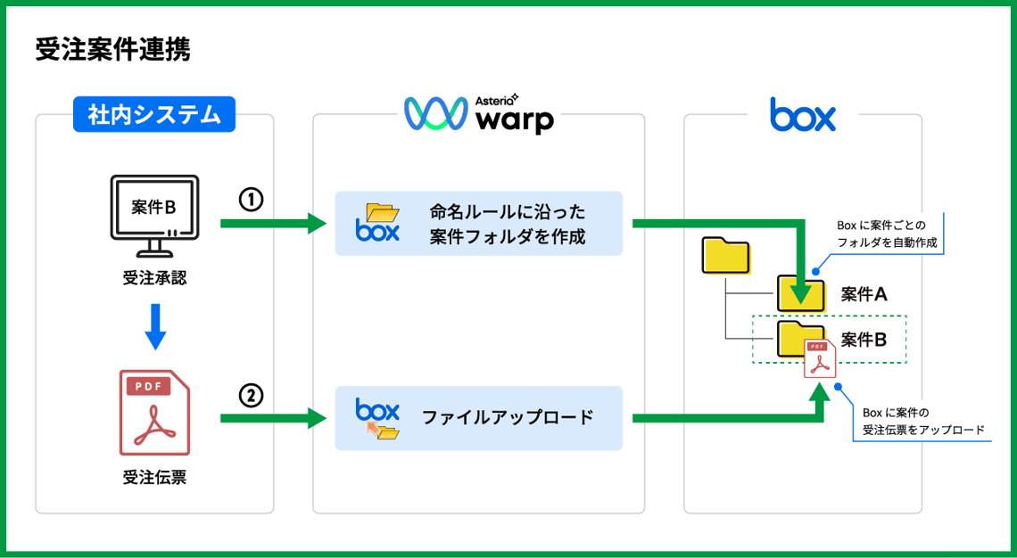 案件を受注し、社内システムで承認されると、Box上にフォルダが自動生成されます。(図中①)さらに、受注伝票のPDFも自動でBoxにアップロードされるようになりました。(図中②)