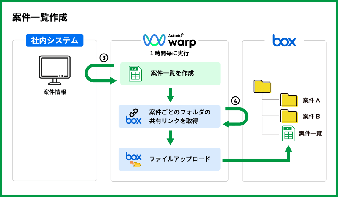 毎月300件以上の案件が発生するため、常に最新の案件一覧を作成することは大きな負担となっていました。そこで、1時間ごとに案件一覧を自動作成する仕組みを構築し(図中③)、常に最新の案件情報を把握できるようにしています。