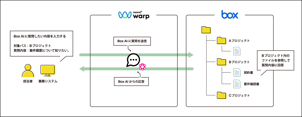 これにより、Box AIを既存の業務フローに柔軟に組み込み、業務の効率化や意思決定の迅速化を実現。さらに、「Box」内に保存されたコンテンツに対して、高度な情報抽出・要約・質疑応答をAIが実行し、蓄積された情報資産をより効率的に活用することが可能となります。